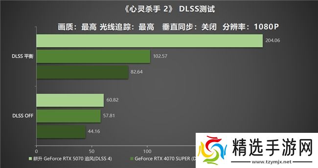通过对《心灵杀手2》进行测试,可以观察到,在1080P的分辨率下,耕升 GeForce RTX 5070 追风在启用DLSS技术时,能达到平均204.06帧的超高帧数。相较于GeForce RTX 4070 SUPER和GeForce RTX 4070的102.57帧和82.64帧,其性能提升涨幅约为94%,展现出比前一代的两款显卡更为卓越的性能表现。