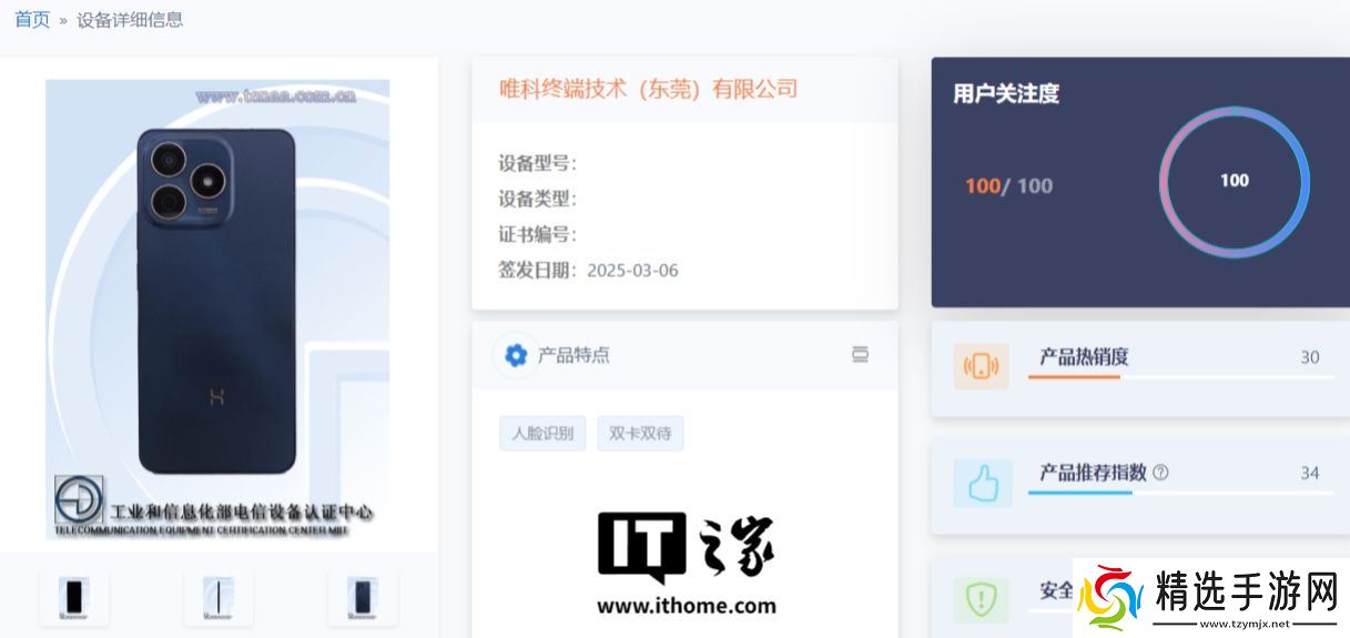 相关页面显示,唯科 WIKO“JLG-AN00”新机尺寸为 163.84×75.23×8.5mm、重约 189.2g,配备 6.56 英寸 TFT 屏幕(分辨率 1612×720、1670 万色显示),内置 5900mAh 电池。
