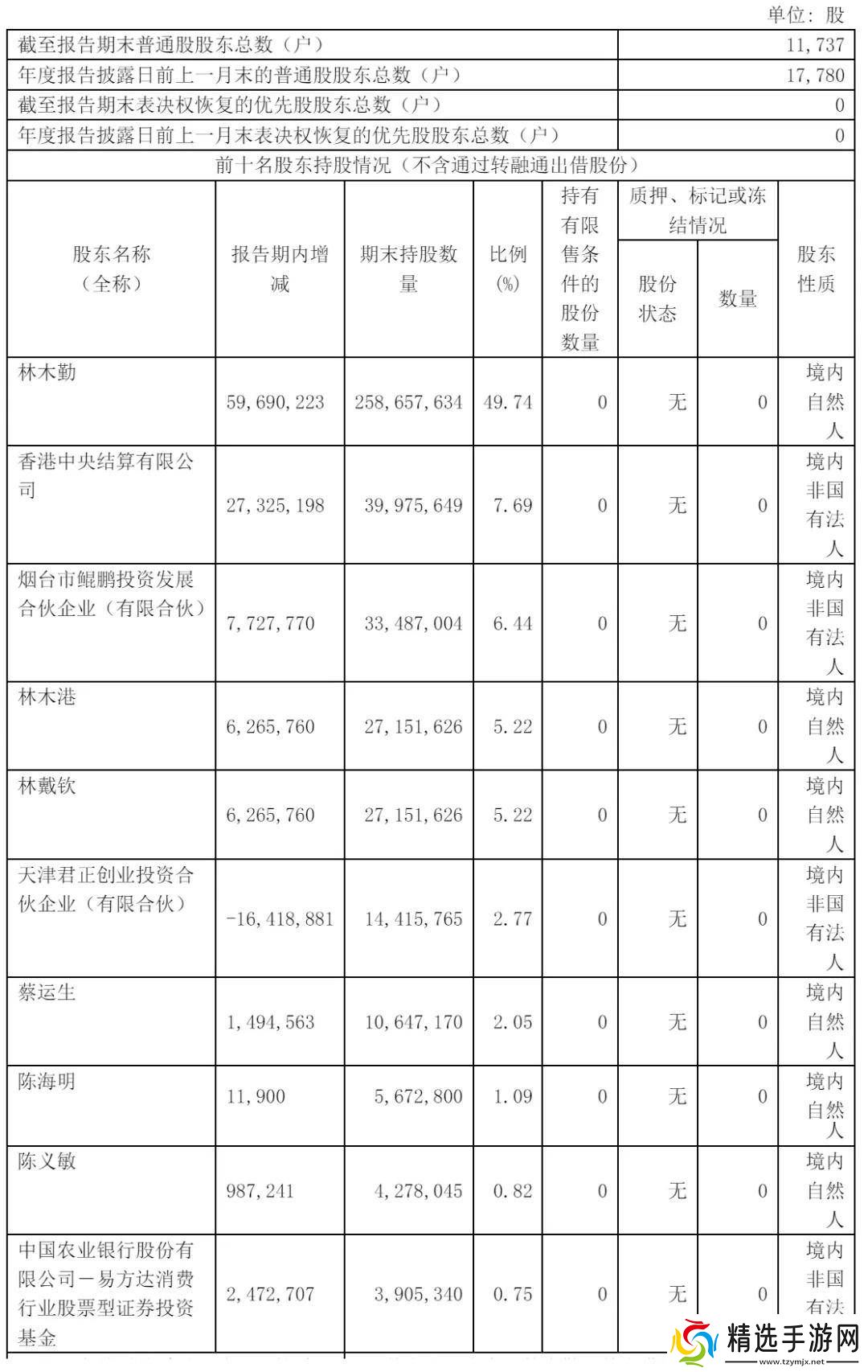东鹏饮料作为一家传统的家族企业,其前十名股东中有多位家族成员。林木勤、林木港、林戴钦等家族成员在公司中担任重要职务,并持有大量股权。这种家族式的经营模式在一定程度上保证了公司的稳定和发展。