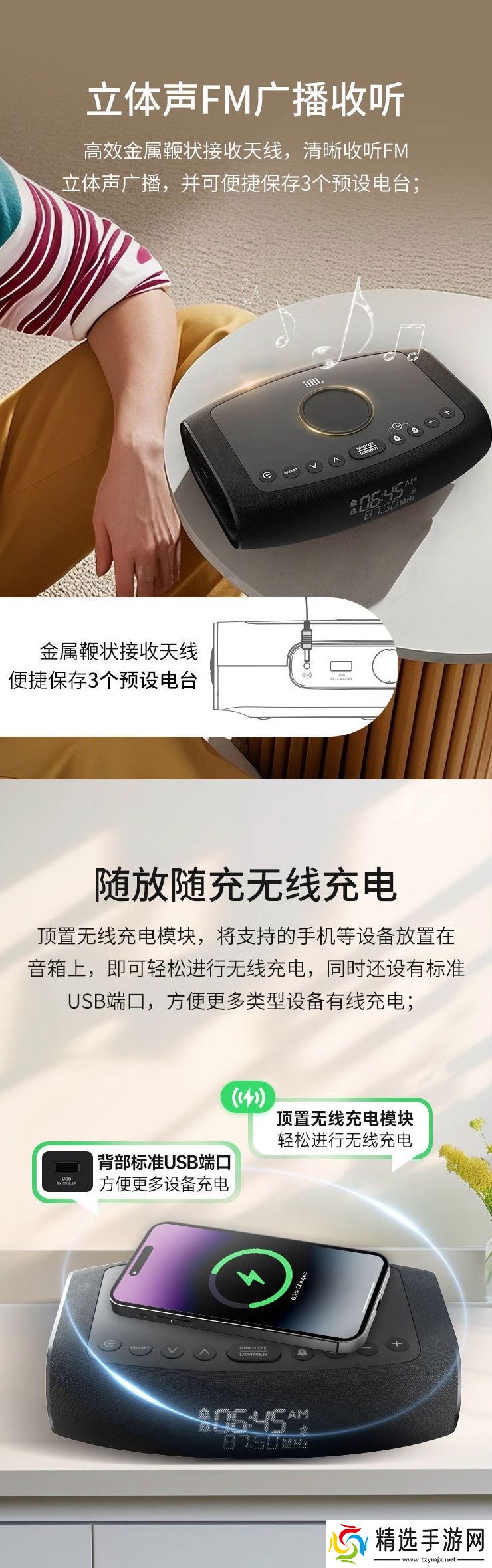 此外,这款蓝牙音箱配备接收天线,可以接收FM立体声广播,音箱顶部配备无线充电模块,但只支持5W无线充电。