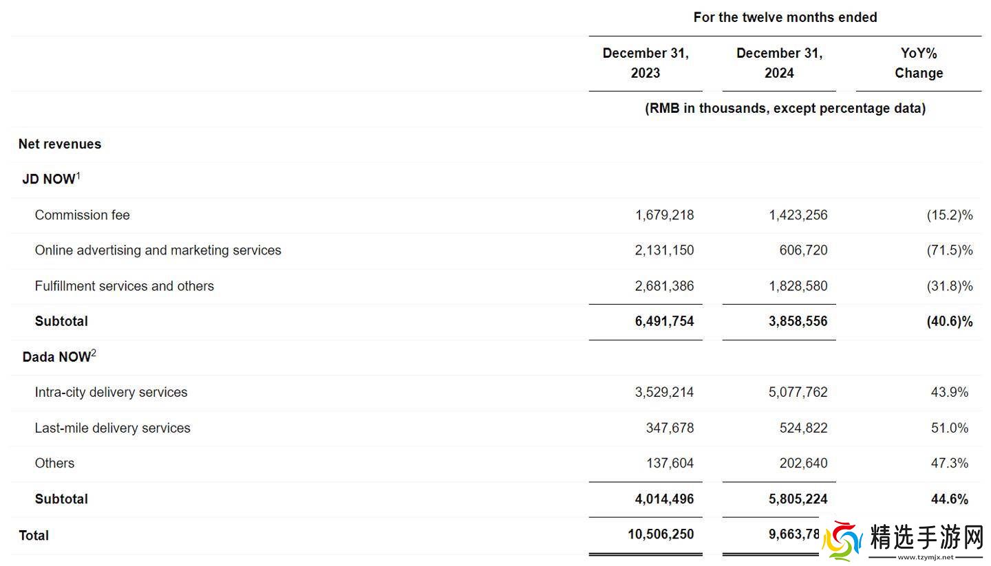具体到各业务板块的收入表现,达达集团从JD NOW(京东秒送)业务中获得的净收入在2024年下降至38.586亿元人民币,远低于2023年的64.918亿元人民币。这一下降主要源于在线广告和营销服务收入以及履约服务和其他收入的减少。