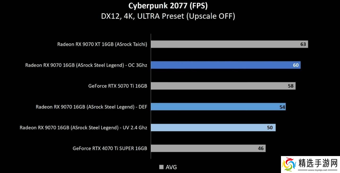 相比之下,RX 9070 XT默认设置的平均帧率为60 FPS,频率为2.90 GHz,功耗为339W,无电压偏移,功率上限为100%;