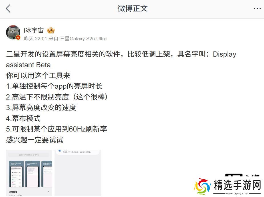 本站 3 月 11 日消息,据博主@i冰宇宙 分享,三星开发的屏幕亮度设置软件“Display Assistant Beta”低调上架,该款应用支持用户单独控制 App 亮屏时长、限制刷新率等。