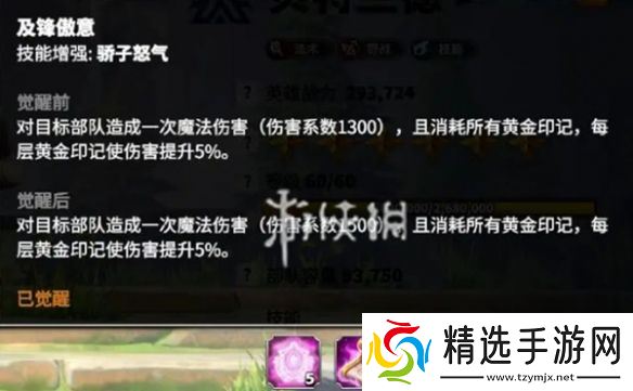 觉醒后:对目标部队造成一次魔法伤害(伤害系数1500),且消耗所有黄金印记,每层黄金印记使伤害提升5%。