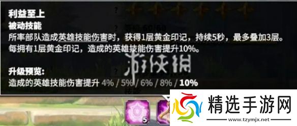 所率部队造成英雄技能伤害时,获得1层黄金印记,持续5秒,最多叠加3层。每拥有1层黄金印记,造成的英雄技能伤害提升10%。