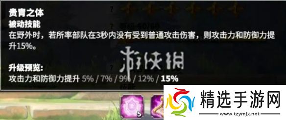 在野外时,若所率部队在3秒内没有受到普通攻击伤害,则攻击力和防御力提升15%。