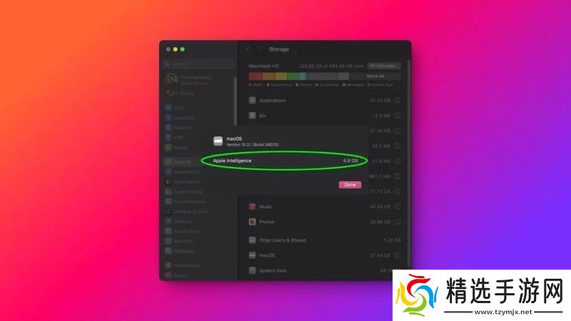 在 macOS Sequoia 15.3.1 版本中,用户可以通过系统设置 ➝ 通用 ➝ 存储,点击“i”按钮查看 Apple Intelligence 功能占用的存储空间。然而,自 macOS 15.4 Beta 2 发布后,苹果移除该功能,用户无法再获取相关存储信息。