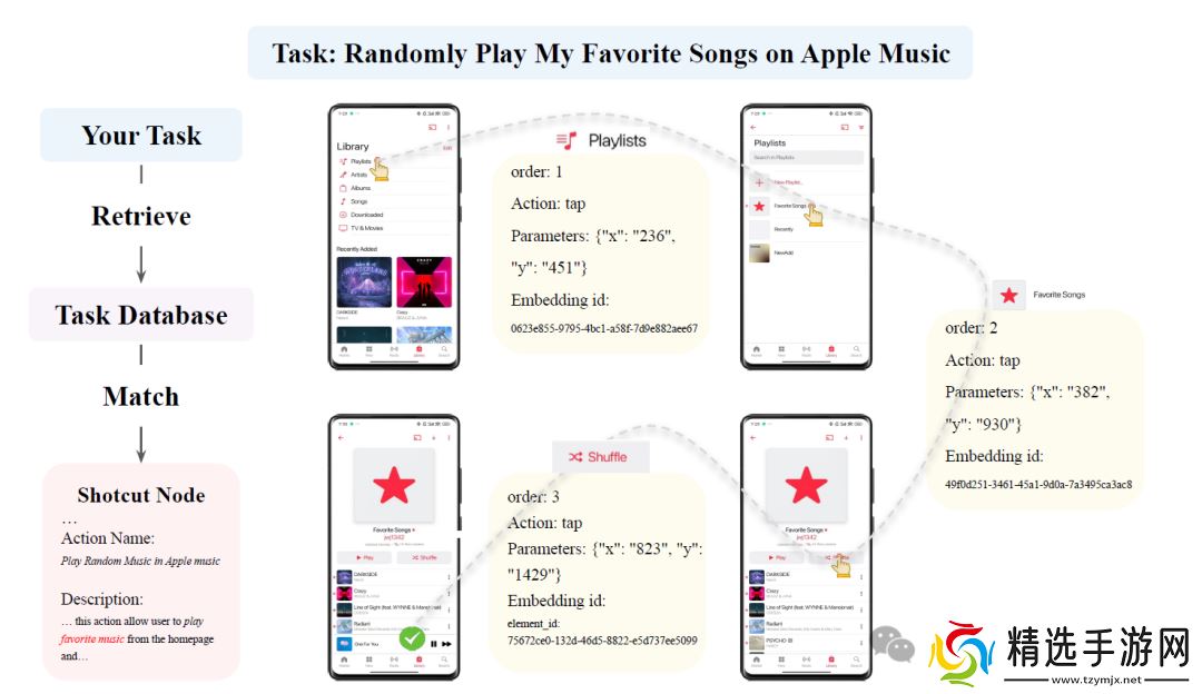下面是一个 AppAgentX 执行播放音乐的一个例子示意图,当找到了“一键”操作,就不需要每一步都耗费大量时间思考下一步需要做什么,从而快速完成任务。