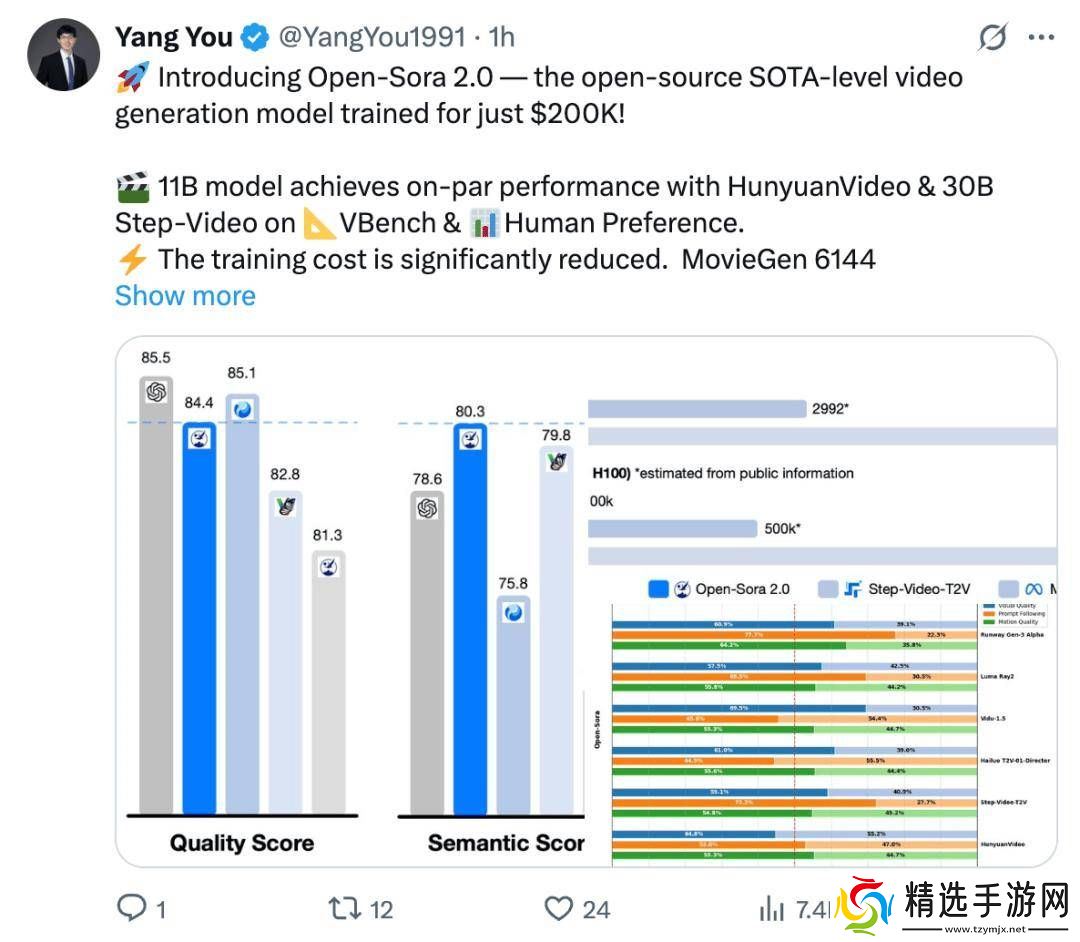 这款新开源的SOTA(State-Of-The-Art)视频生成模型,以令人瞩目的性价比吸引了业界的广泛关注。据透露,潞晨科技仅花费了20万美元(折合人民币约144.9万元),利用224张GPU成功训练出了商业级别的11B参数视频生成大模型。其性能卓越,直逼腾讯的混元和拥有30B参数的Step-Video。