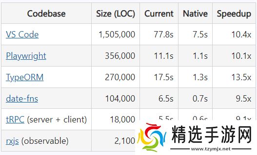 微软官方测试显示,本地实现已经能够加载许多流行的 TypeScript 项目,包括 TypeScript 编译器本身。以下是在 GitHub 上一些不同大小的流行代码库上运行tsc的时间: