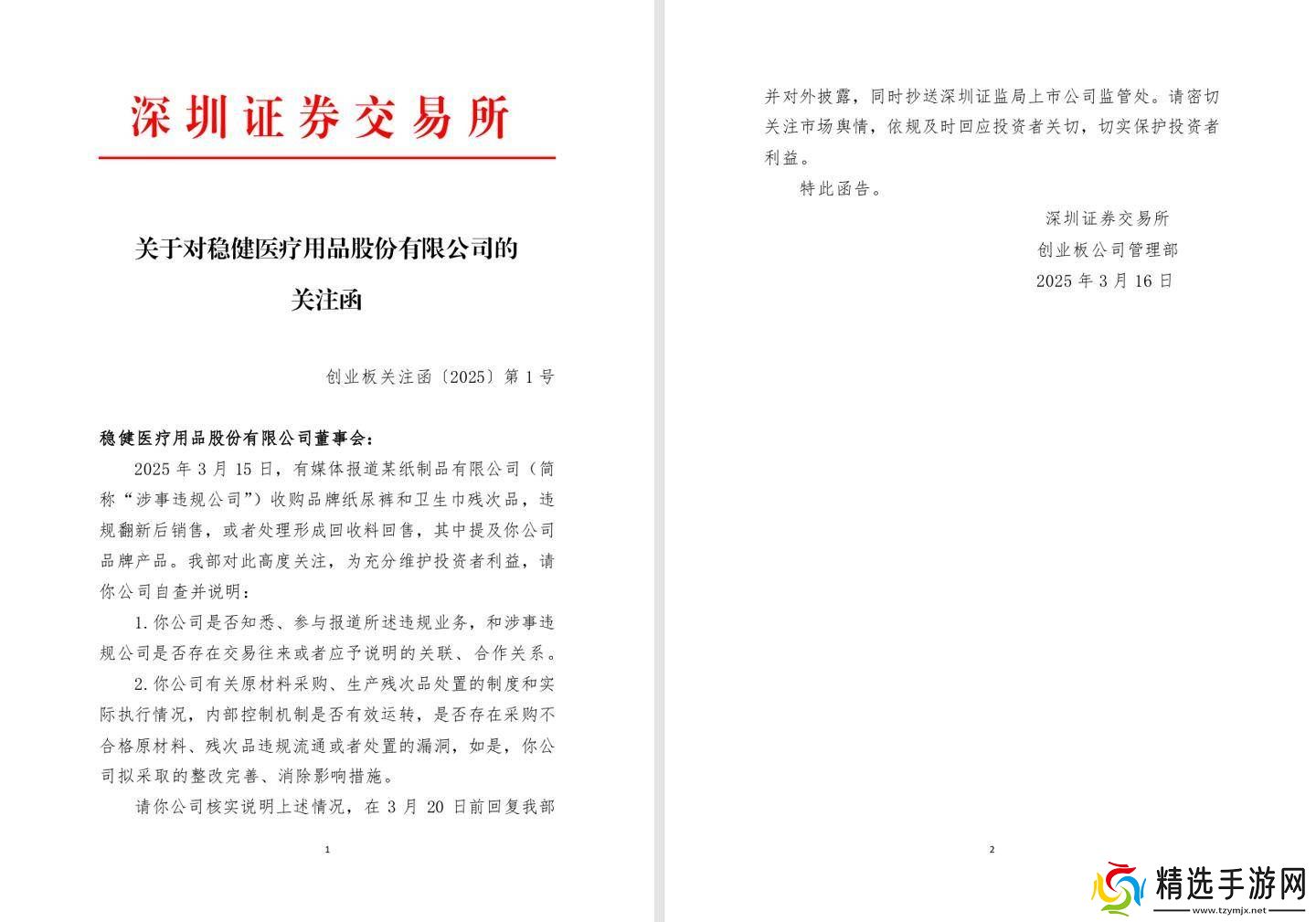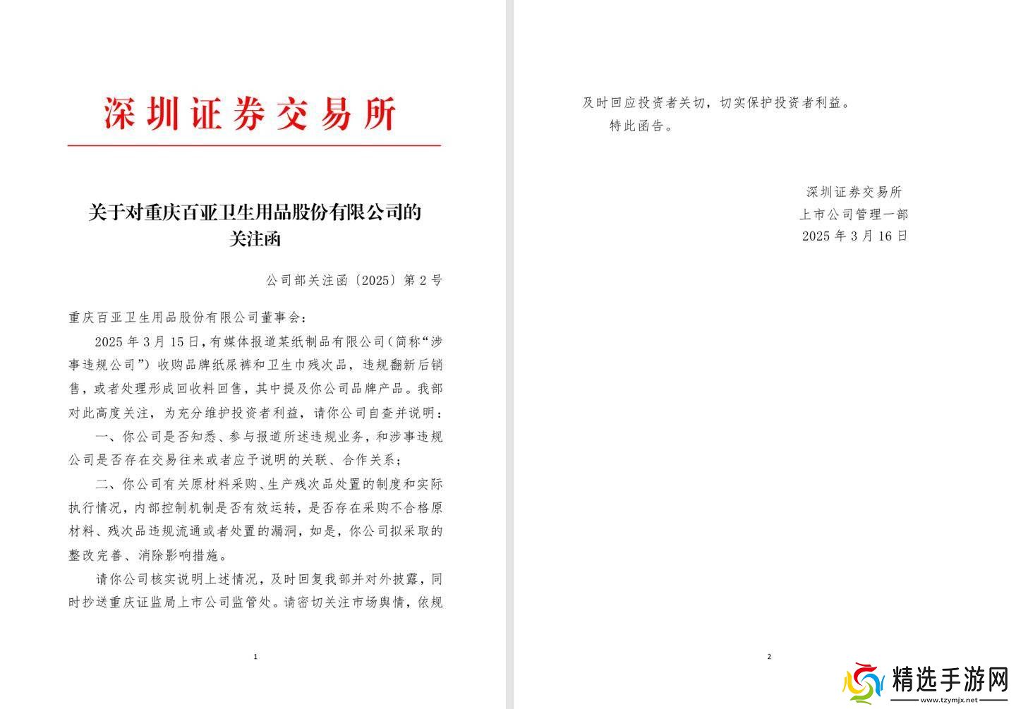 近期,资本市场监管动态引人注目,深圳证券交易所对两家卫生用品行业上市公司发出了关注函。首先,重庆百亚卫生用品股份有限公司,即知名品牌“自由点”的母公司,收到了来自深交所上市公司管理一部的关注要求。这份关注函中,深交所要求该公司全面自查,并详细说明是否了解或参与了相关报道中提及的违规业务活动,以及是否与报道中涉及的违规公司存在任何形式的交易往来、关联关系或合作关系。