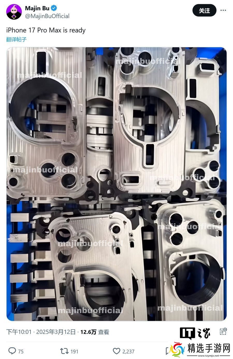 本站 3 月 13 日消息,消息源 @MajinBuOfficial 昨日(3 月 12 日)在 X 平台发布推文,分享了苹果 iPhone 17 Pro Max 的金属框架,从精密开孔来看,符合此前渲染图的横向大矩阵设计。