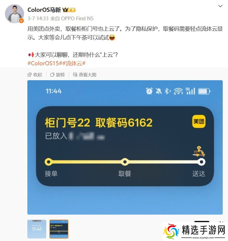 本站 3 月 9 日消息,OPPOColorOS 用户体验与解决方案总监马新本周发文透露,ColorOS 系统流体云已适配美团外卖取餐柜号(为了隐私保护,取餐码需轻点流体云显示)。