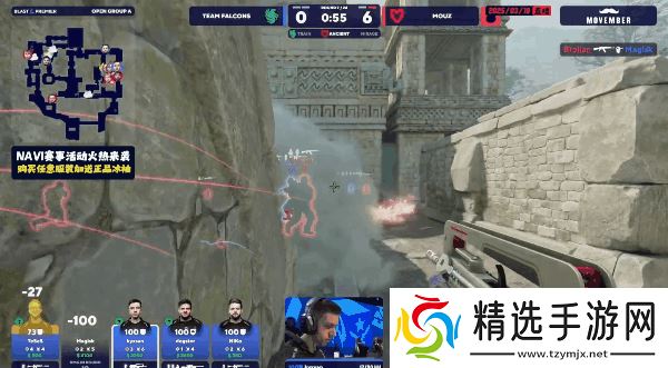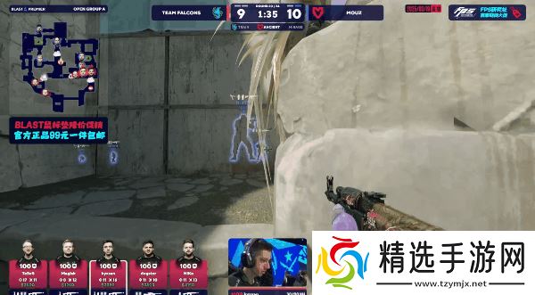 下半场Falcons来到进攻方,手枪局同样甜甜圈夹A,单人防守的Jimpphat仅仅打出一换一后Falcons直接拿下A包点,残局回防的MOUZ随着A大的CT被击杀后慢慢输掉回合。紧接着MOUZ强起前顶中路,kyxsan直接拿下三杀帮助队伍奠定胜局。比分顺势来到6-9。