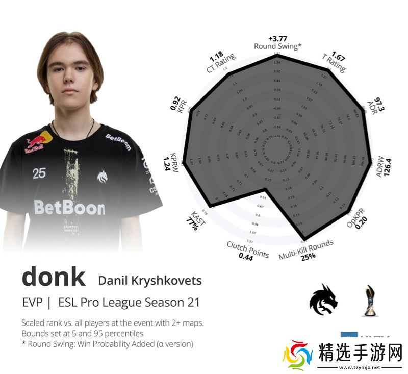 donk在小组赛阶段的rating为1.74,不可否认,正是这样的表现为他赢得了EVP荣誉——这种在小组赛中的状态极为出色,以至于早早锁定了这一奖项的案例十分罕见。