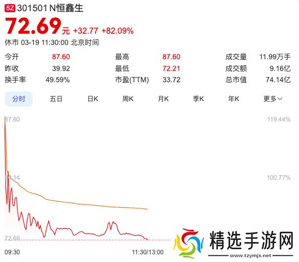 3月19日,恒鑫生活以39.92元/股的发行价正式上市,开盘即大涨119.4%,达到87.6元/股。至午间收盘,股价稳定在72.69元,公司总市值攀升至74.14亿元。