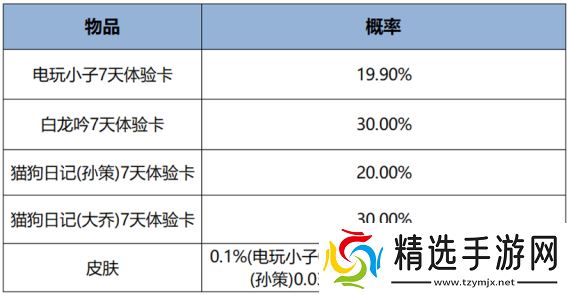 打开后必得皮肤碎片x2、铭文碎片x100和以下随机奖励之一:皮肤或皮肤体验卡(7日)1张(鲁班七号-电玩小子、韩信-白龙吟、孙策-猫**记、大乔-猫**记)