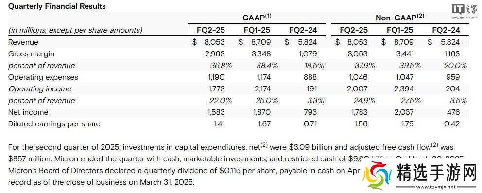 在利润层面,美光科技公司取得了不俗的成绩。按照通用会计准则(GAAP)计算,公司净收入为15.8亿美元,折合成人民币约为114.27亿元,摊薄后每股收益为1.41美元。而在非GAAP标准下,净收入更是达到了17.8亿美元,摊薄后每股收益为1.56美元。