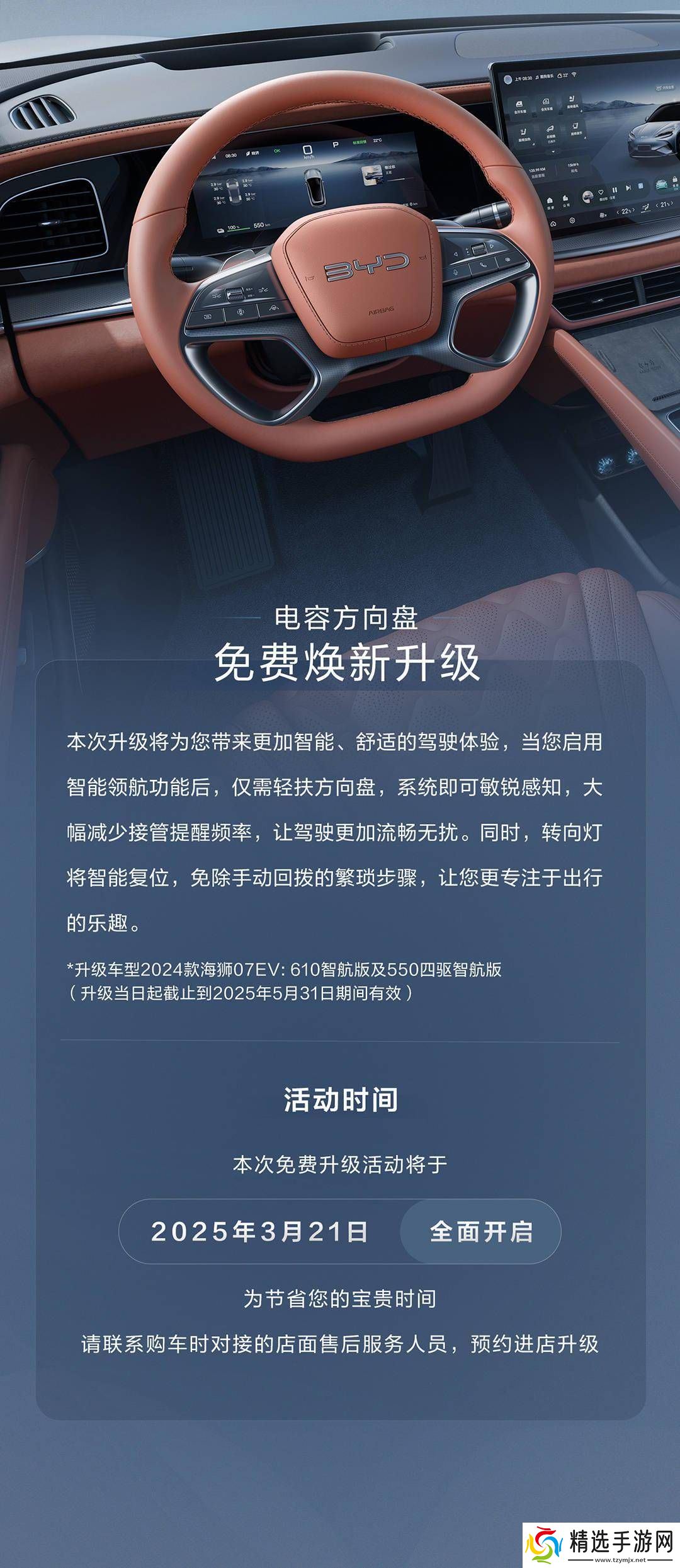 比亚迪近日正式推出了一项针对2024款海狮07 EV用户的特别升级活动,该活动于3月21日正式启动,为用户提供电容方向盘及配套组合开关的免费焕新服务。