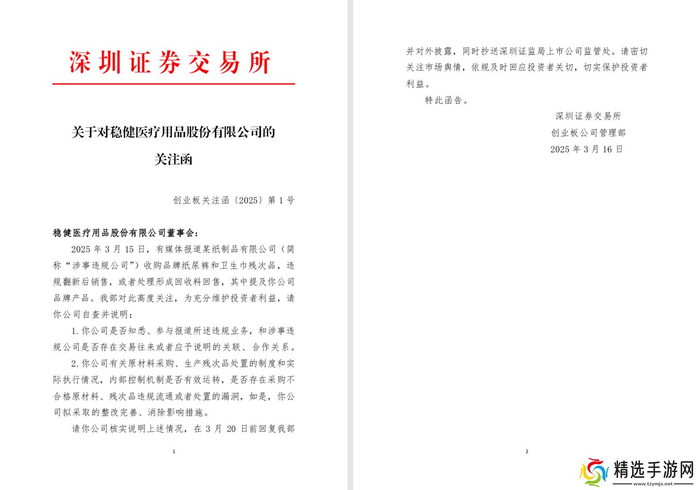 “全棉时代”母公司也收到了来自深圳证券交易所的关注函。该公司被要求自查并说明是否知悉、参与报道所述违规业务、原材料采购、生产残次品处置的制度和实际执行情况、是否存在采购不合格原材料、残次品违规流通或者处置的漏洞,并被要求在 3 月 20 日之前回复深交所创业板公司管理部并对外披露,同时抄送深圳证监局上市公司管理处。