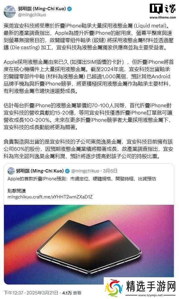 在经济效益方面,郭明錤估算,每台折叠屏iPhone的液态金属组件成本约为70至100元人民币。而首批折叠屏iPhone的推出,预计将为液态金属的独家供应商宜安科技带来约15至20亿元人民币的营收增长,相当于其营收增长100%至200%,仅凭这一订单就实现了显著的业绩增长。