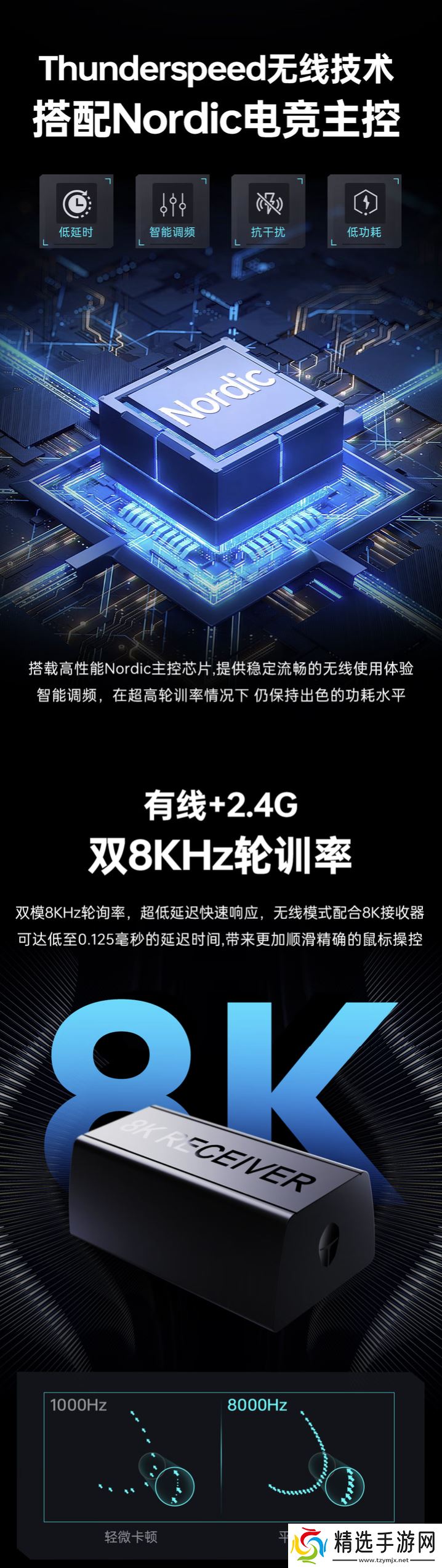 规格方面,该鼠标配备PAW3950 PRO传感器,支持双8KHz回报率,同时搭载Thunderspeed无线技术及 Nordic 电竞主控,内置 400 毫安时电池,至高拥有 110 小时续航。