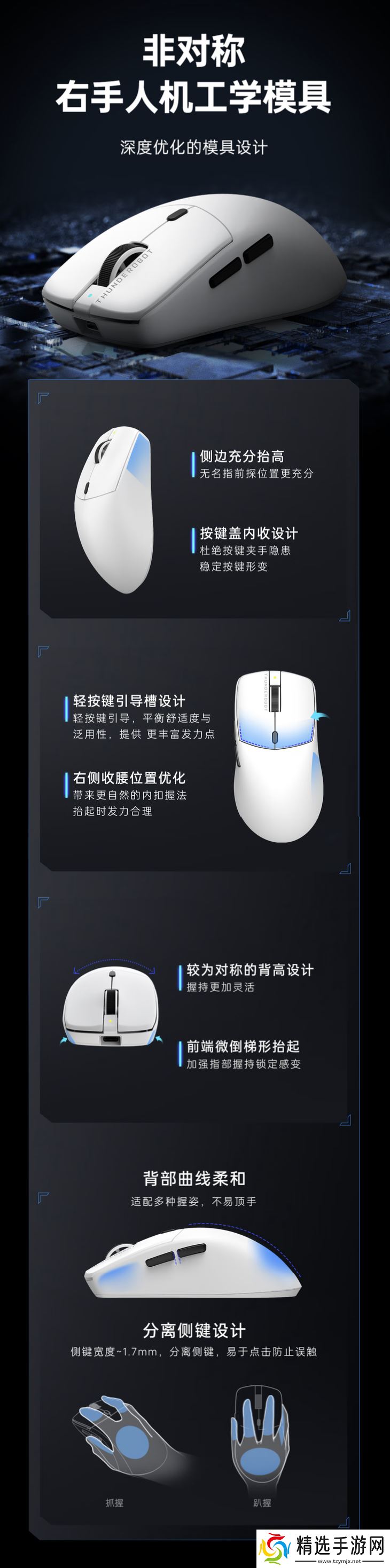 这款鼠标可选黑白双色,整体重量57克,号称引入了非对称右手人体工学模具及“按键辅助回弹系统”,适用于中大手形使用。