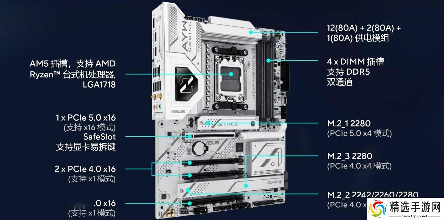 X870 AYW GAMING WIFI W主板采用了ATX大板设计,配备了8层PCB,拥有12+2+1相80A的强大供电系统,以及两组EPS CPU 8Pin供电接口,确保了主板的稳定性和高性能。