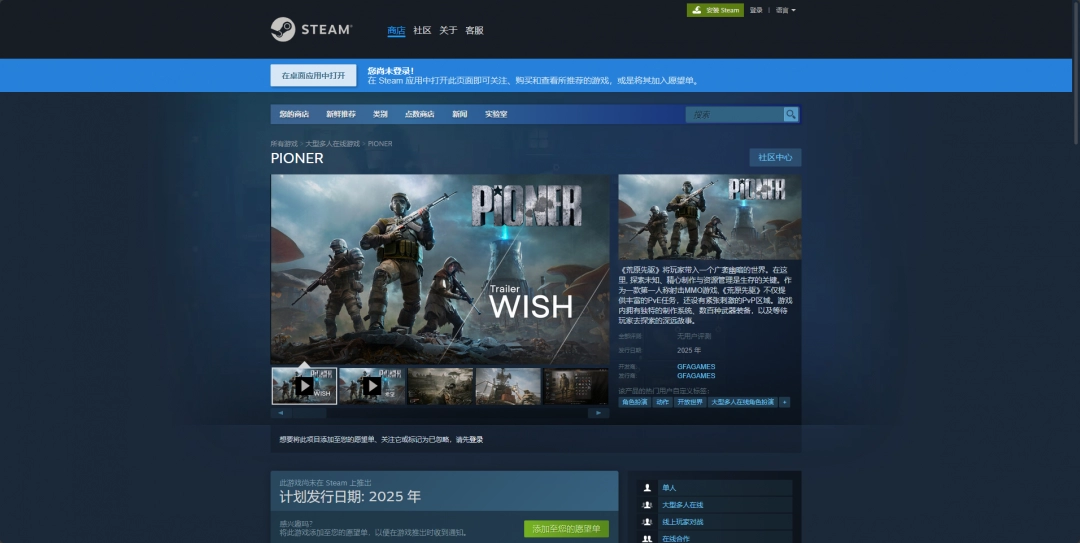 《荒野先驱》是GFAGAMES制作发行的第一人称射击MMO游戏,而这款游戏的下载网址就是购买平台的购买页面,比如Steam版就是在购买页面购买之后,点击页面中的马上开玩就可以开始下载了。
