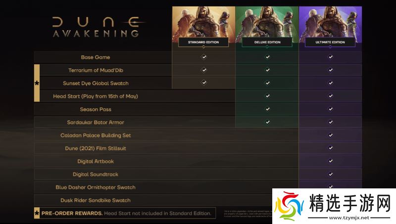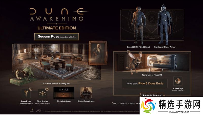 在版本设置上,《沙丘:觉醒》提供了标准版、豪华版和终极版三种选择。标准版售价为160元人民币,而豪华版和终极版则分别定价为230元和300元。除了价格上的差异,豪华版和终极版玩家将享受5天的抢先体验特权,并获得多种独特物品。特别是终极版,更是包含了长达90分钟的精彩数字原声带、电影中保罗·厄崔迪的标志性蒸馏服、数字艺术画册等丰富奖励。