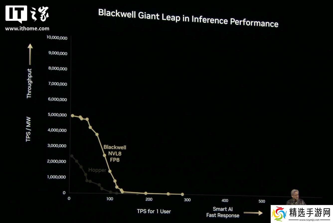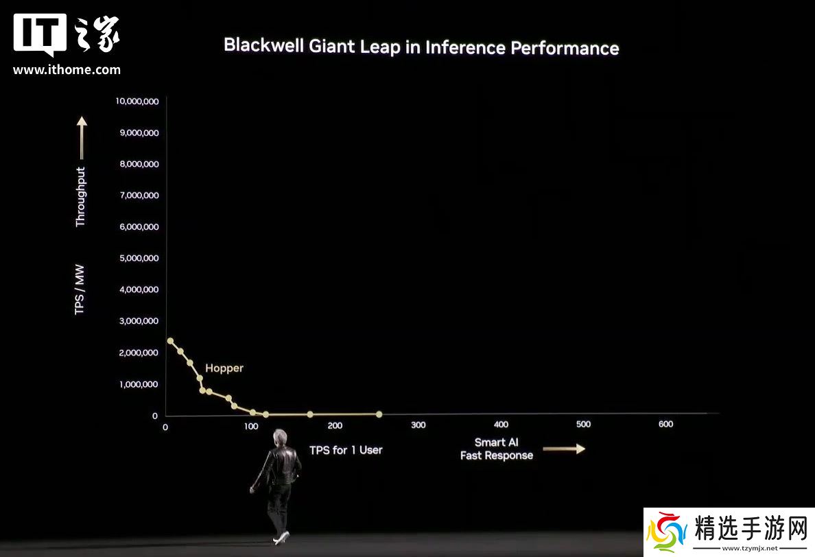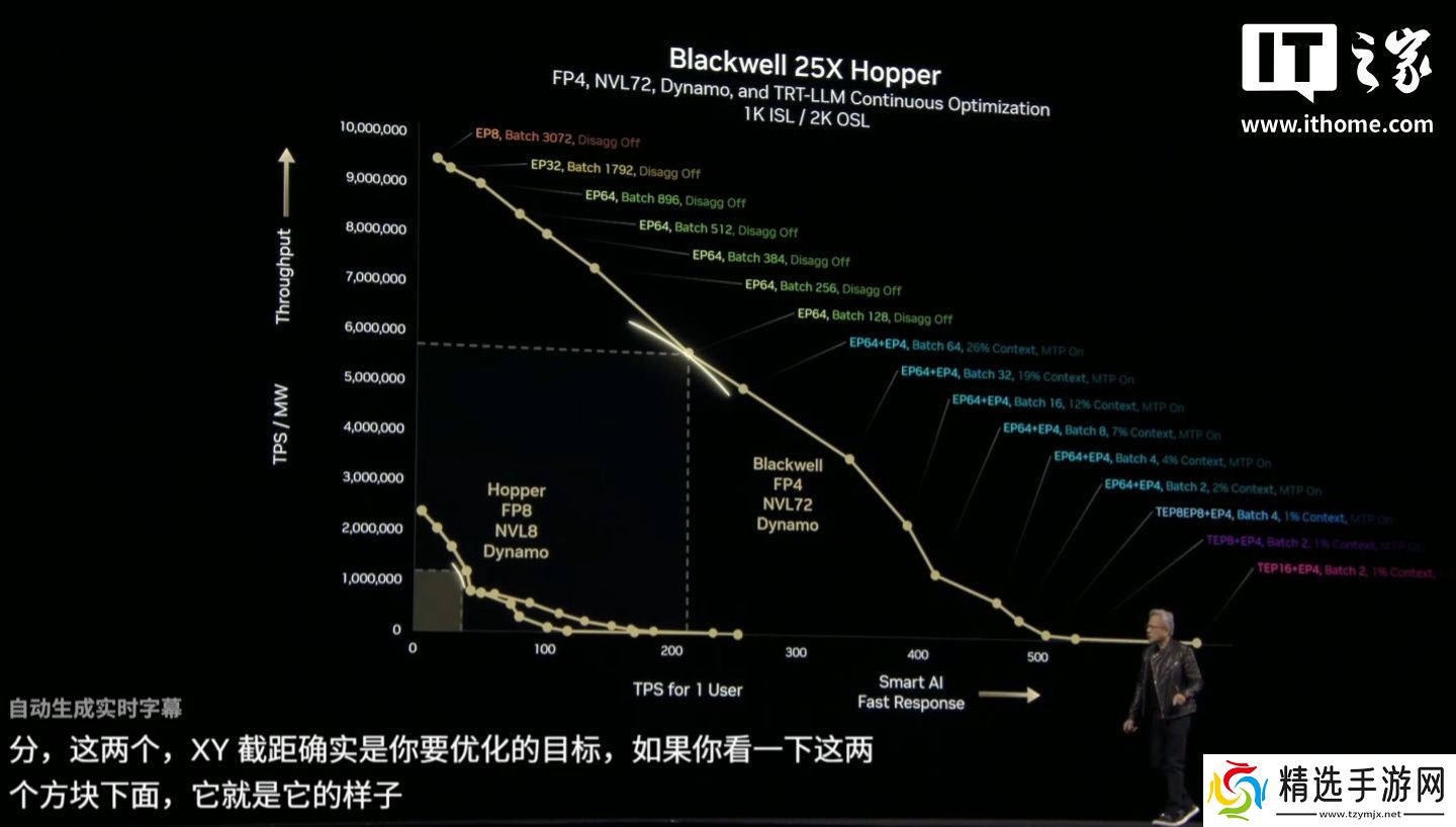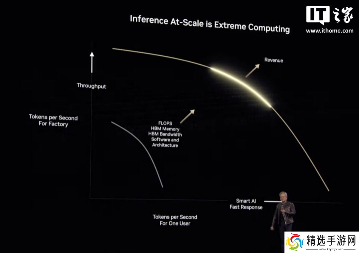 黄仁勋展示了一张关于推理的图表,X 轴显示用户每秒的 Token 数,Y 轴显示工厂每秒的 Token 数。