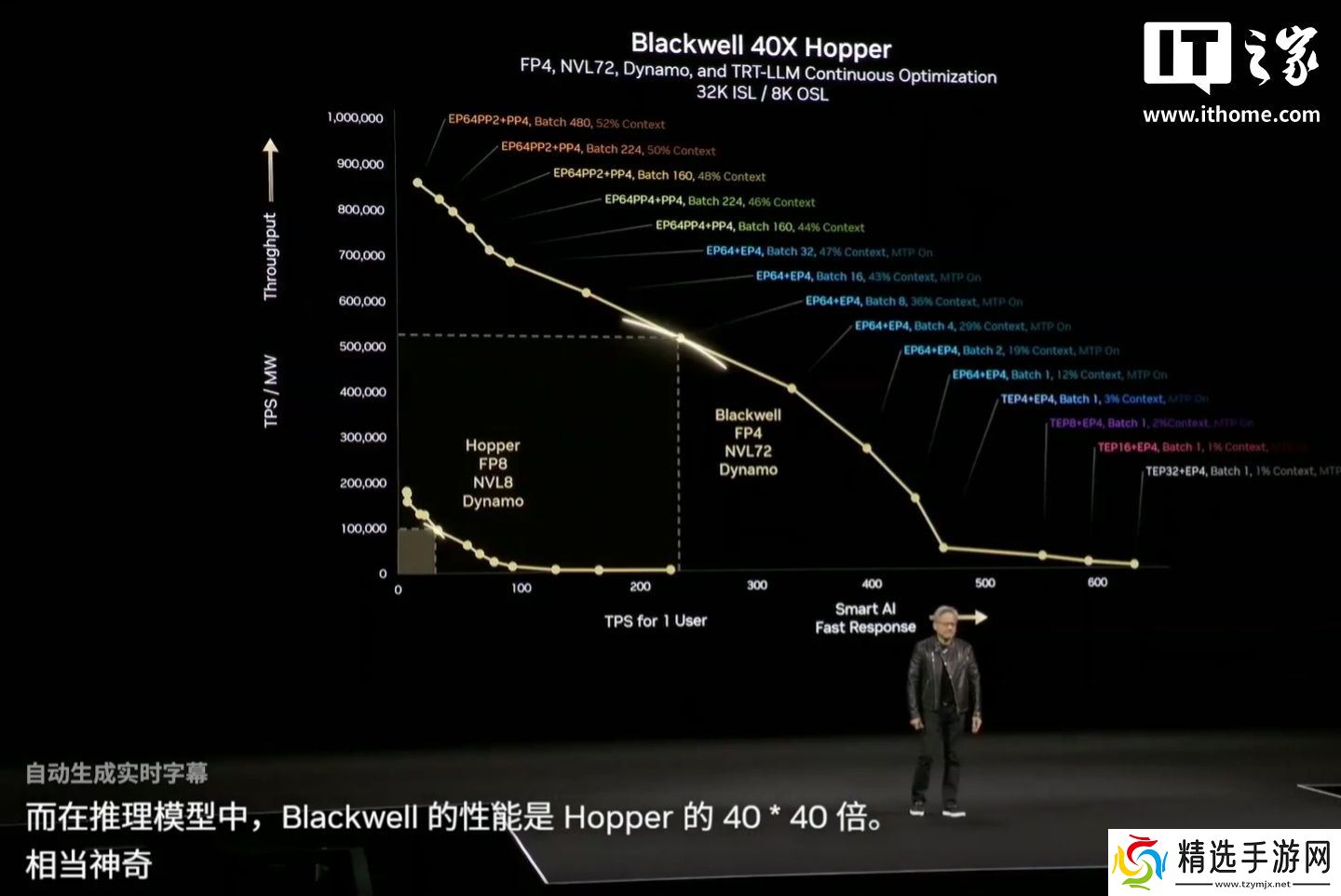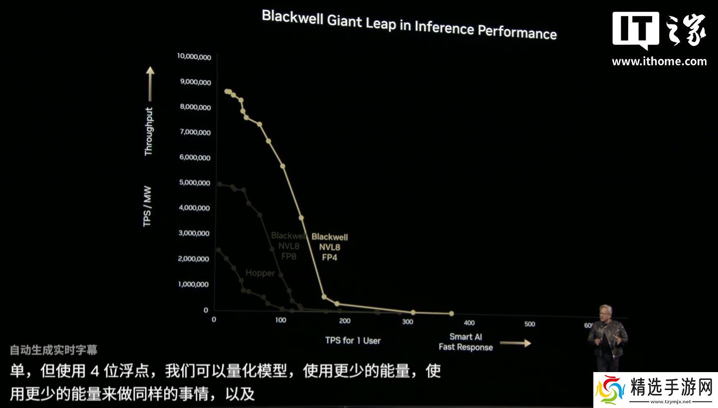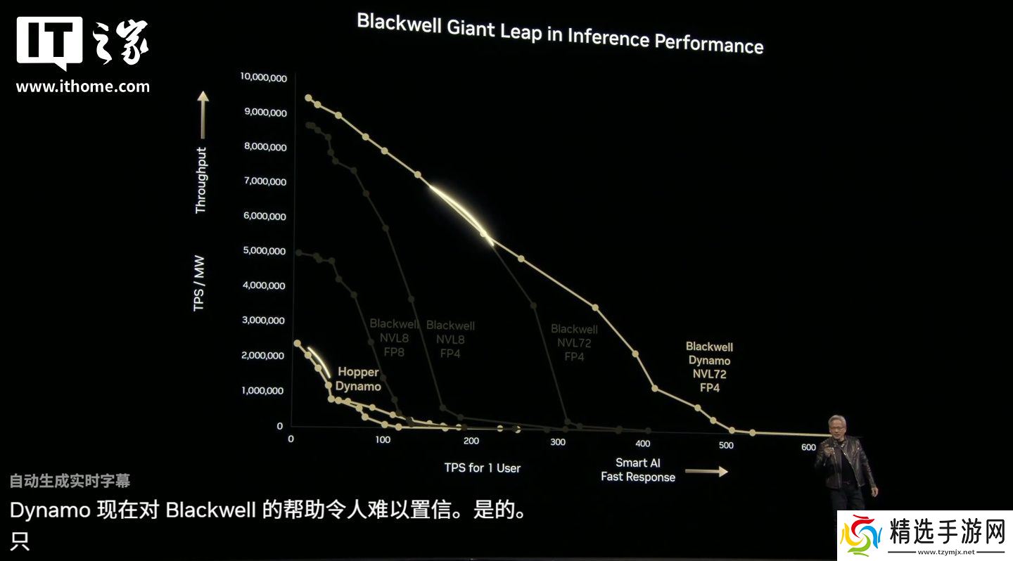 黄仁勋展示了一张关于推理的图表,X 轴显示用户每秒的 Token 数,Y 轴显示工厂每秒的 Token 数。