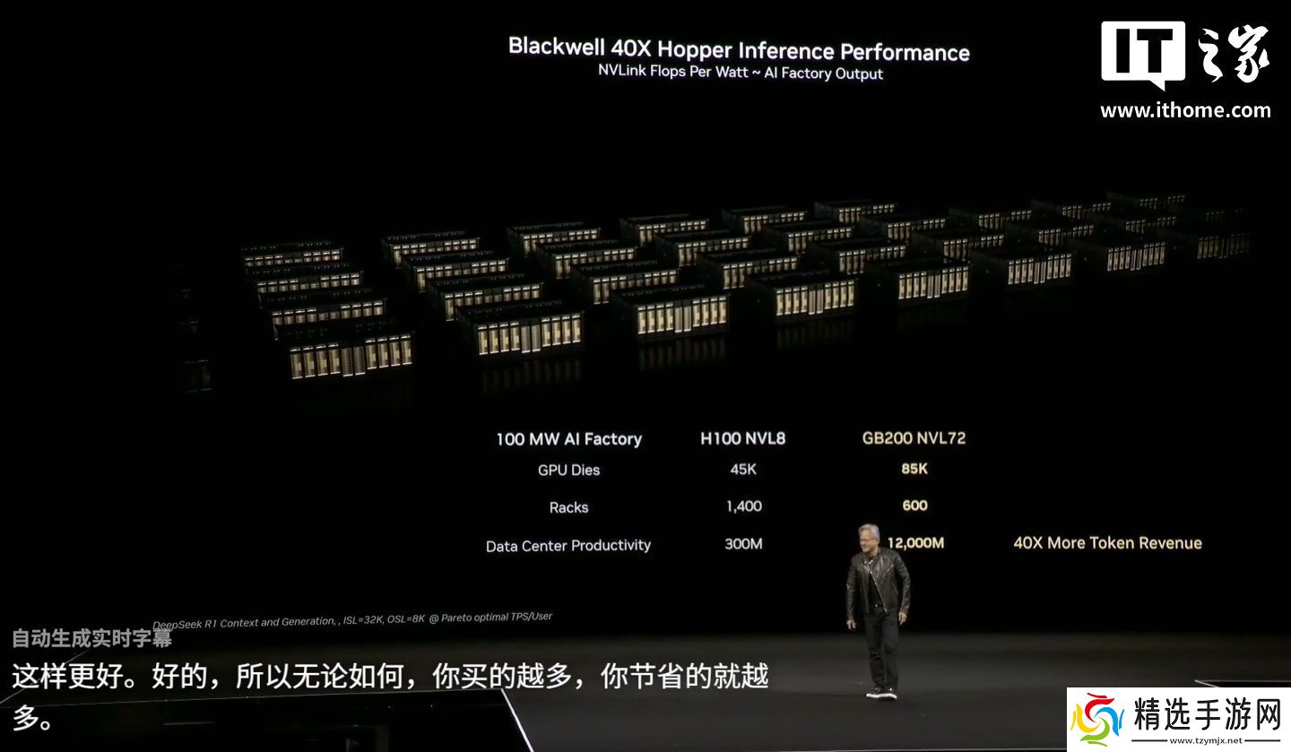 本站注意到,黄仁勋还打趣道,有了上述最新技术加持,搭建 AI 工厂的厂商“买得越多、省得越多”,总而言之就是掏钱吧。