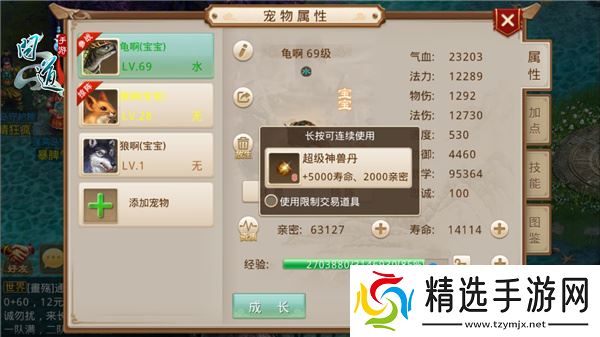 1、在问道手游内可以使用超级神兽丹,来快速提升宠物的亲密度,是最快速的方式;