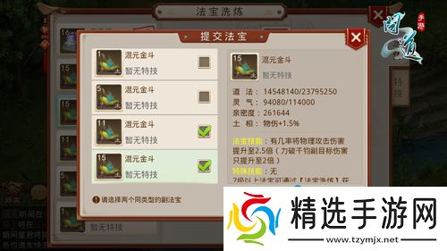 5、仅七级以上法宝可作为主法宝进行洗炼,副法宝没有等级限制,唯一限制的是相同类型法宝;