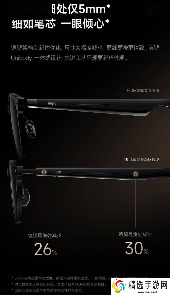 小米MIJIA智能音频眼镜2近日正式启动众筹活动,这款眼镜以其精致的设计与强大的功能吸引了广泛关注。据官方介绍,这款眼镜的镜腿部分经过优化,最细处达到了5毫米,整体尺寸显著减小,为用户提供了更为舒适的佩戴体验。
