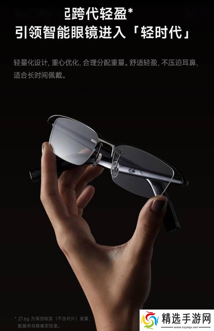 在设计上,MIJIA智能音频眼镜2采用了Unibody一体式前脚设计,镜腿的最细处相比前代减少了26%,最宽处也减少了30%。同时,该眼镜还采用了轻量化设计,深空钛款不含衬片的重量仅为27.6克,佩戴起来几乎感觉不到负担。