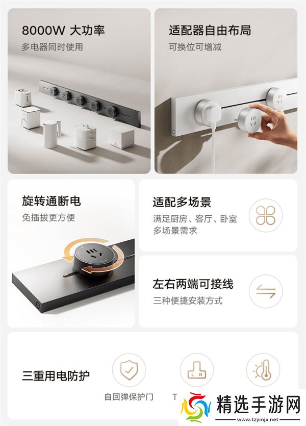 在安全性方面,小米轨道插座采用了多项创新设计。它配备了自回弹封闭式保护门,当用户取下适配器后,保护门会自动回弹关闭,有效防止儿童误触,同时也能减少油烟和灰尘的进入,保持插座的清洁与安全。