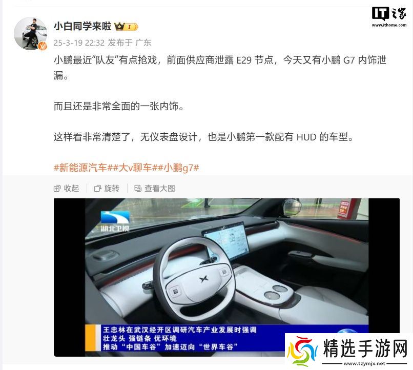 本站 3 月 19 日消息,湖北卫视今晚播出了省委书记王忠林在武汉经开区调研的新闻,随着电视画面一同亮相的,还有小鹏全新车型 G7 的内饰布局。