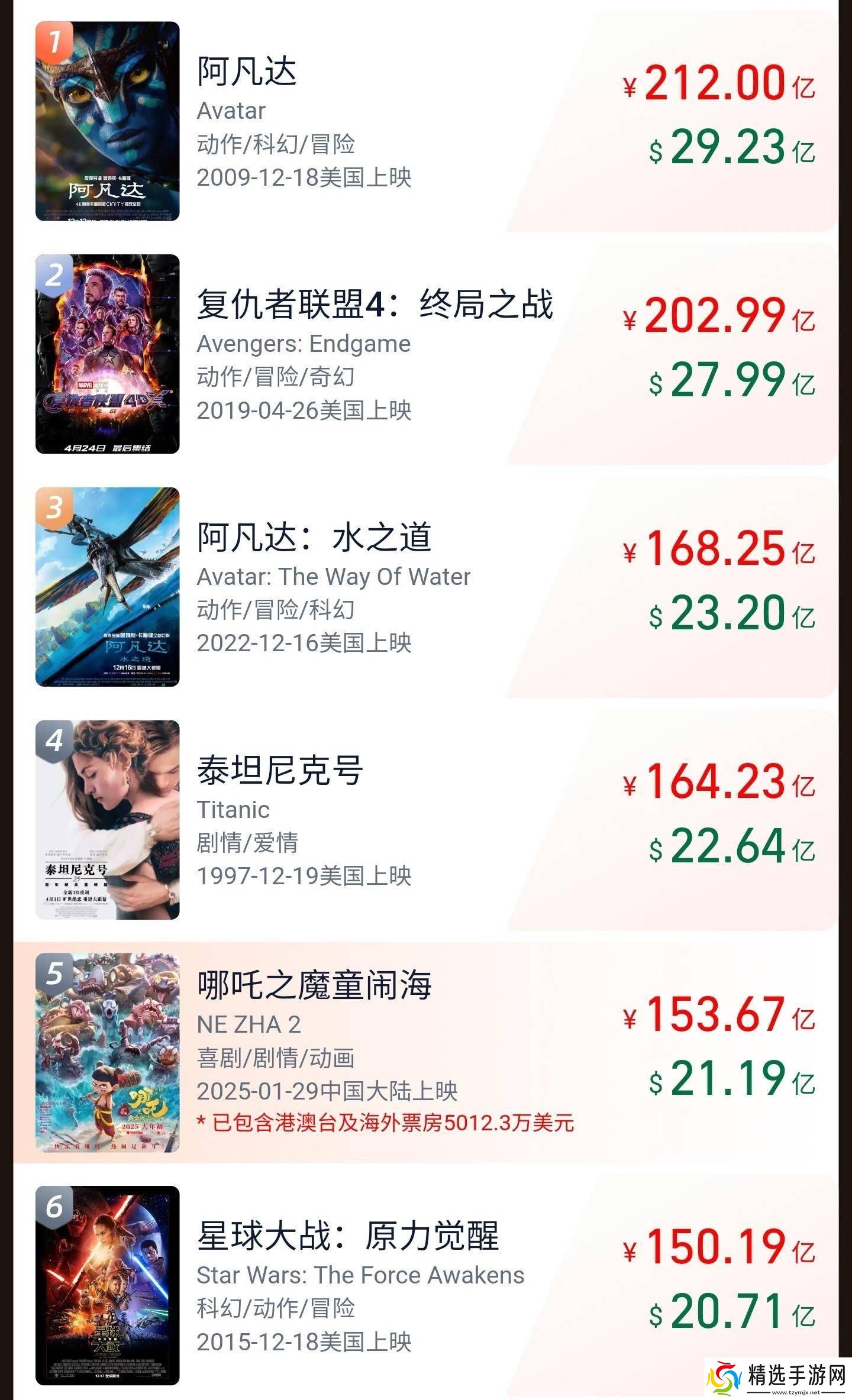 在全球市场方面,《哪吒之魔童闹海》同样展现出了强大的票房号召力,其全球票房已累计达到153.67亿元,成功跻身全球影史票房榜第五名。尽管与排名第四的《泰坦尼克号》相比,仍有约10亿元的差距,但这一成绩已足够令人瞩目。