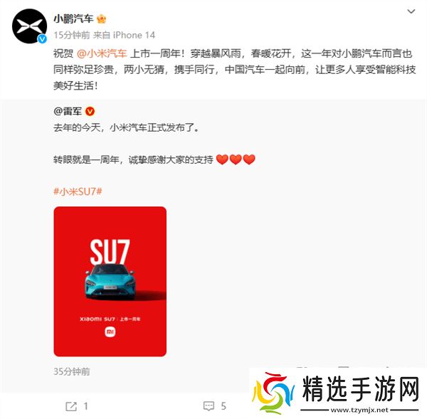 值此上市一周年之际,小鹏汽车通过官方渠道向小米汽车送上了温馨的祝福。小鹏汽车的微博中洋溢着深情厚谊:“历经风雨,共迎春光,这一年对小鹏而言同样意义非凡。我们携手并进,在中国汽车的广阔舞台上,共同推动智能科技的发展,让智能生活触手可及。”