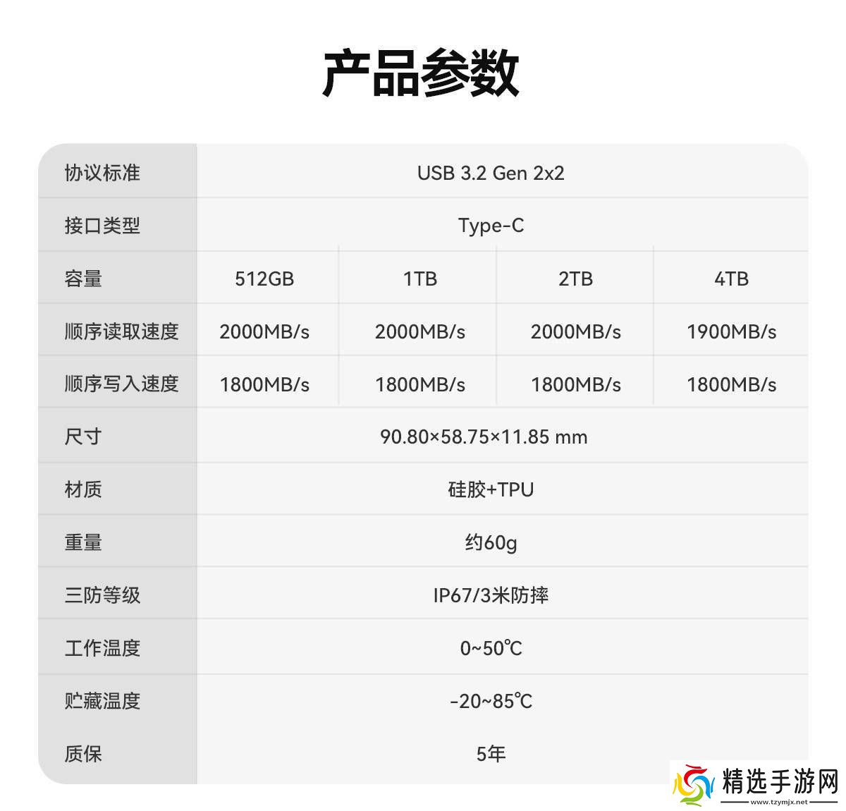 在性能方面,PR2000同样表现出色。它搭载了USB 3.2 Gen 2×2 (20Gbps)主控芯片,并采用了高品质的3D TLC NAND闪存,容量范围从512GB到4TB不等,满足了不同用户的需求。佰维还为这款硬盘提供了长达5年的质保服务,让用户在使用过程中更加安心。