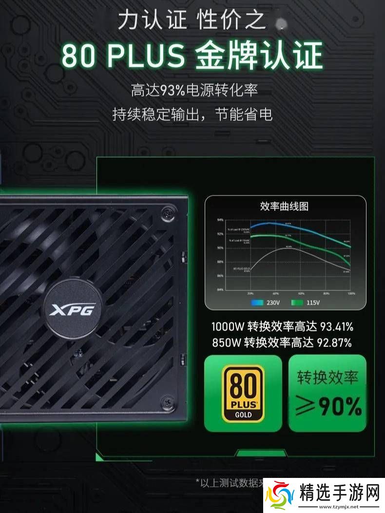 XPG魔核SP电源系列推出了850W和1000W两种功率版本,以满足不同用户的需求。其中,850W版本提供了黑白两种配色选择,峰值转换效率可达92.87%;而1000W版本目前仅提供黑色款式,但其峰值转换效率更高,达到了93.41%。两款产品均获得了80 PLUS金牌认证,体现了其出色的能效表现。