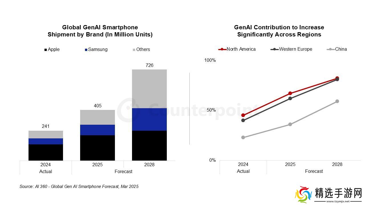 本站 3 月 20 日消息,市场调查机构 Counterpoint Research 昨日(3 月 19 日)发布博文,预测 2025 年全球智能手机中将有三分之一(约 4 亿台)具备生成式人工智能(GenAI)功能,较 2024 年的五分之一显著增长。