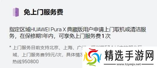 为了让用户享受更加便捷的服务,华为还为指定区域内的Pura X用户提供了专业的上门取机或清洁服务。值得注意的是,Pura X普通版用户每次上门服务需支付99元,而典藏版用户则可在保修期内享受一次免费上门服务。