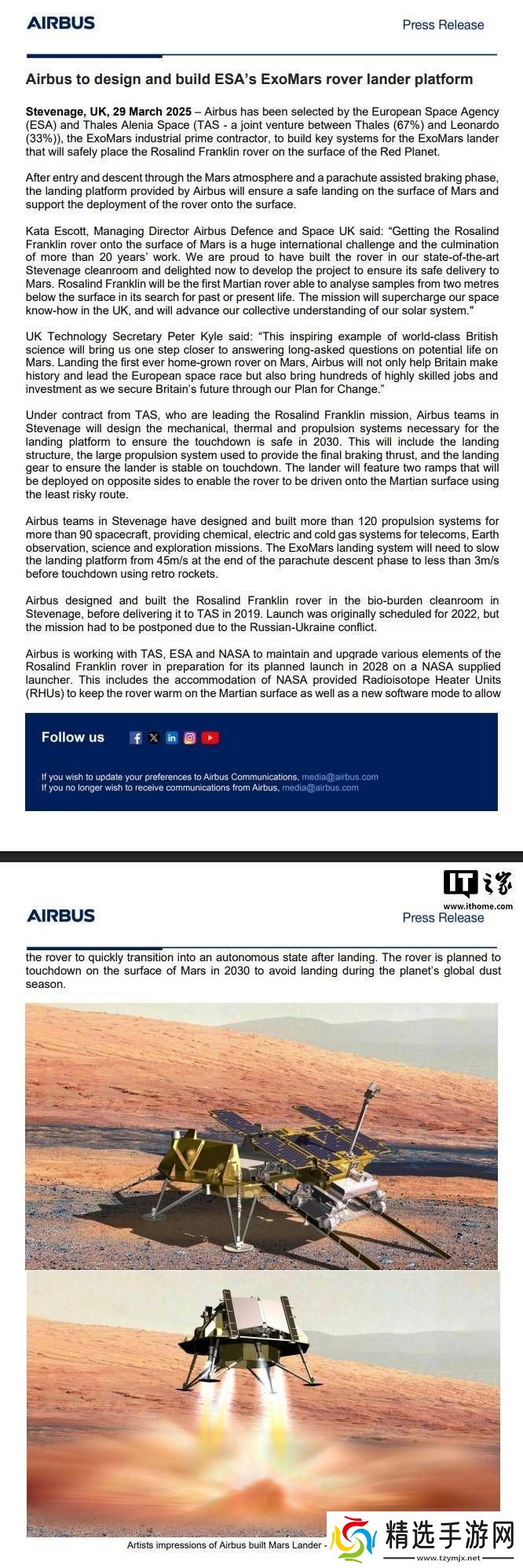 空客负责设计的着陆器,其主要职责是确保罗莎琳德-富兰克林(Rosalind Franklin)漫游车安全降落在火星表面,并提供必要的部署支持。机械、热能和推进系统的设计将由空客工程师团队全面负责。