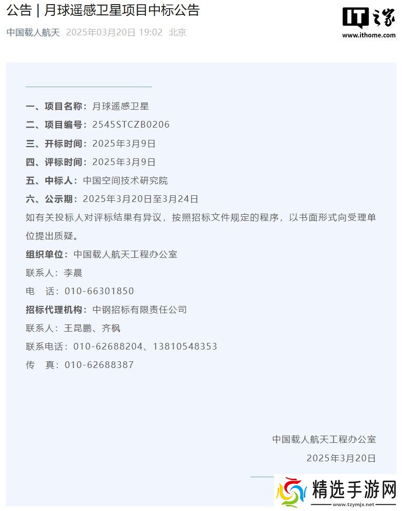 本站 3 月 20 日消息,中国载人航天今日发布月球遥感卫星项目中标公告,该项目编号 2545STCZB0206、中标人为中国空间技术研究院。公告原文内容如下:
