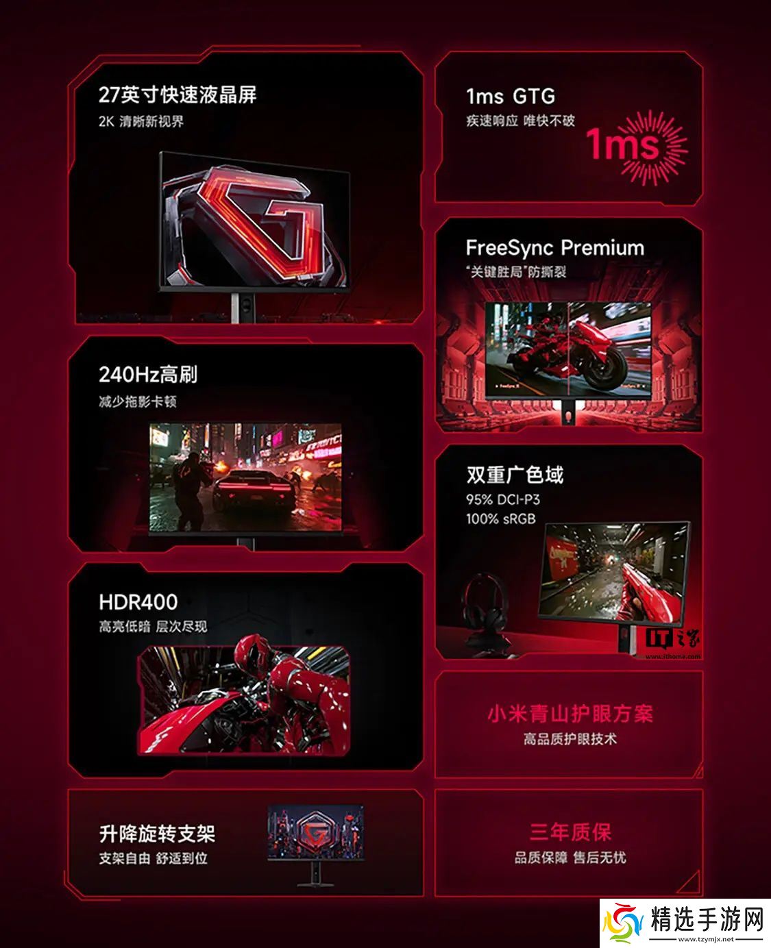 本站注意到,这款显示器采用 27 英寸 Fast IPS 面板,具备 2K 分辨率、240Hz 刷新率、1ms GTG 响应时间、95% DCI-P3 色域及 100% sRGB 色域,支持 HDR400、FreeSync Premium,还有小米青山护眼功能。