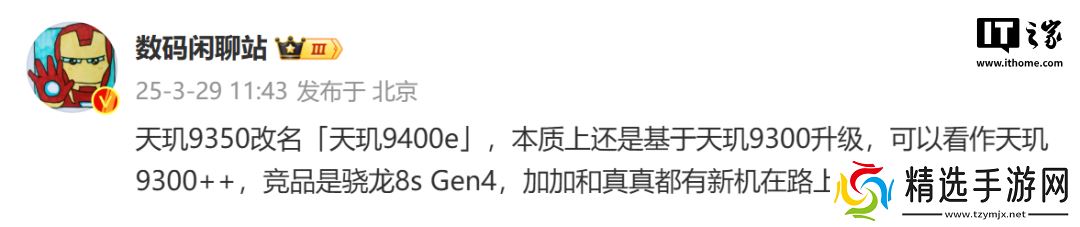 也许是受到 iPhone 16e 命名的启发,也可能是汲取了 PC 行业英特尔和 AMD 的命名方式,博主 @数码闲聊站 的最新爆料显示原本的“天玑 9350”已经改名为“天玑 9400e”了。