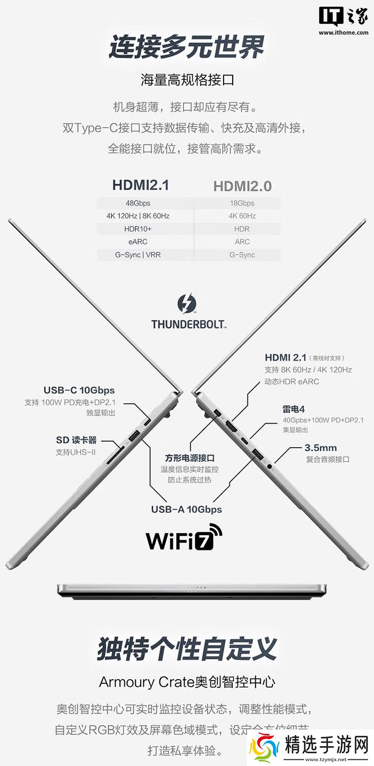 I/O方面,该机左侧配备1个 HDMI 2.1接口、1 个雷电 4 接口、1个 USB-A 10Gbps接口、1个 3.5mm音频接口;右侧配备1个 USB-C 10Gbps接口、1个 USB-A 10Gbps接口、1个 SD卡读卡器。
